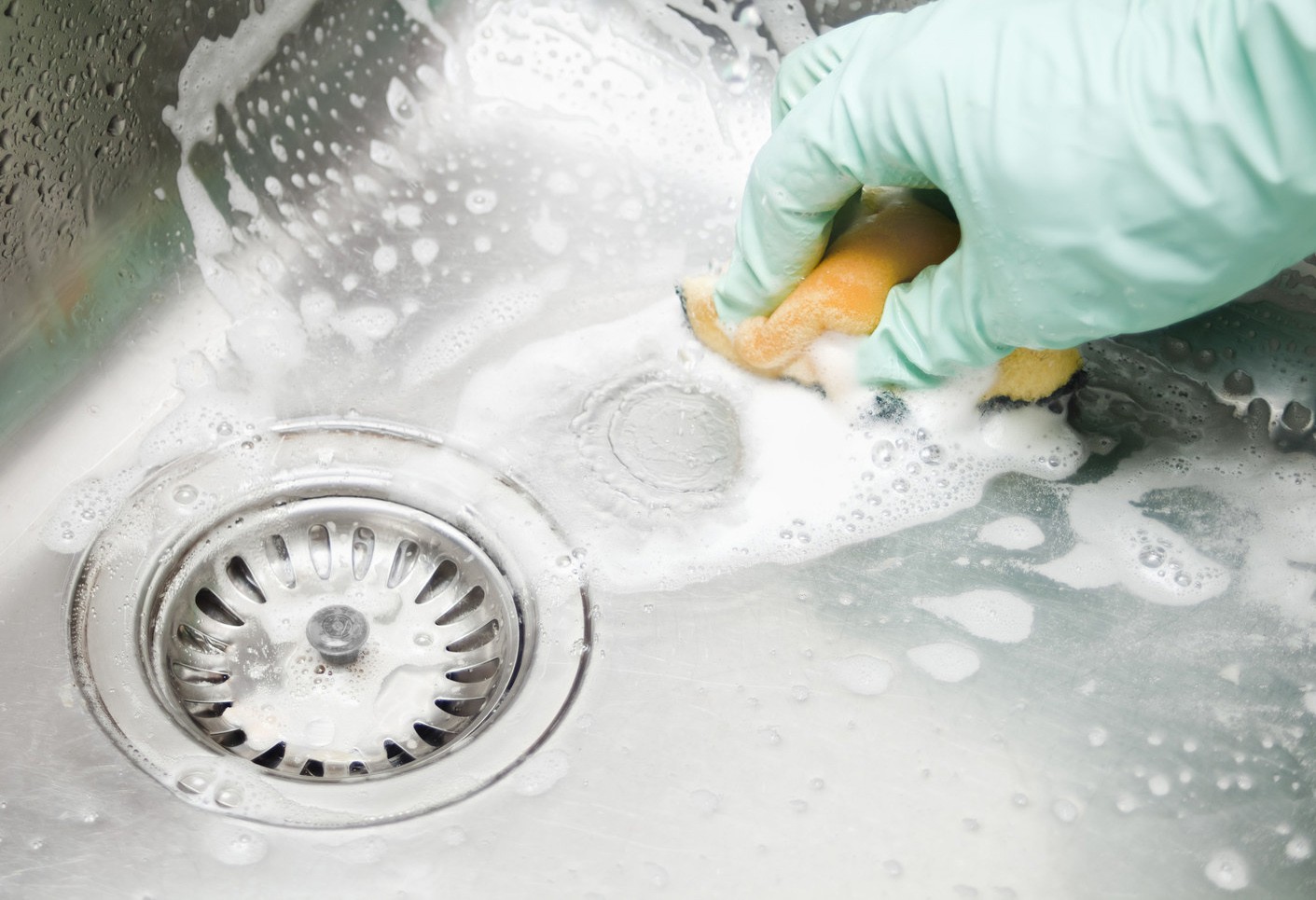 6. Sau khi rửa chén bát xong, rửa bồn rửa chén với nước nóng cùng bọt biển và nước rửa bát. Sau đó, tráng lại bằng nước nóng một lần nữa.