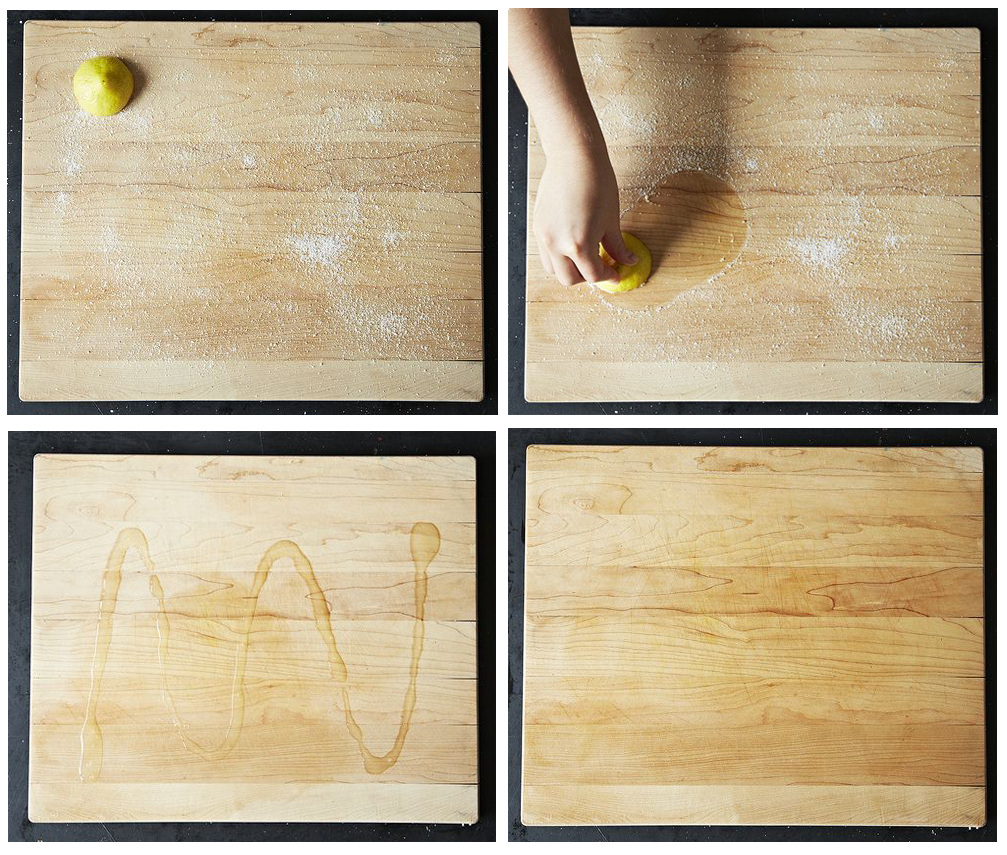 8. Rắc một ít muối lên thớt rồi lấy nửa quả chanh lau lên muối. Sau đó cho một ít dầu khoáng lên trên mặt thớt và sau khoảng 10 phút thì lau sạch lại lần nữa.