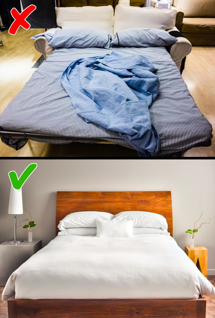 Tuy rằng giường sofa có thể giúp bạn tiết kiệm không gian và tiền bạc nhưng việc gập ra gập vào mỗi ngày cũng khá phiền, lại khiến ngôi nhà trông kém sang. Bên cạnh đó chất lượng giường sofa khó lòng đảm bảo chất lượng giấc ngủ của bạn. Tốt nhất, bạn hãy cố gắng tiết kiệm, đầu tư mua hẳn một chiếc giường với tấm đệm loại tốt. Chi phí ban đầu có thể cao nhưng xét về lâu dài chúng sẽ bền hơn, và đảm bảo cho bạn có một giấc ngủ ngon nữa.