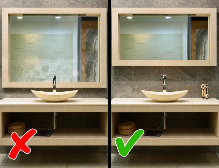 Gương lớn trong phòng tắm ngay phía trên bồn rửa mặt sẽ rất nhanh trở nên lem nhem bởi những vệt nước bẩn, khiến cho bạn rất khó chịu khi nhìn. Vậy nên nếu chọn gương tắm, hãy chọn loại gương có kích thước vừa phải, đặt cao hơn bồn rửa chén khoảng 18 – 25cm. Điều này sẽ tránh cho việc nước bắn lên gương, và bạn cũng không phải lau chùi gương tắm thường xuyên.