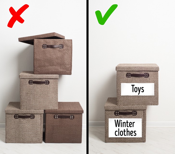 Hộp là vật dụng quen thuộc và tiện lợi để đựng đồ đạc. Tuy nhiên, nếu chúng ta sử dụng quá nhiều hộp, để mỗi nơi một cái thì rất có thể bạn sẽ chẳng nhớ có gì trong hộp. Và kết quả là vừa lãng phí thời gian, lại vừa lãng phí không gian, khiến nhà cửa bừa bộn. Tốt nhất là hãy phân loại đồ dùng của bạn, để vào từng hộp riêng biệt và dán giấy ghi loại vật dụng trong hộp bên ngoài để tiện cho việc tìm kiếm. Những vật ít khi dùng cất vào trong hộp, còn lại những thứ hay dùng nên để bên ngoài để thuận tiện cho việc sử dụng.