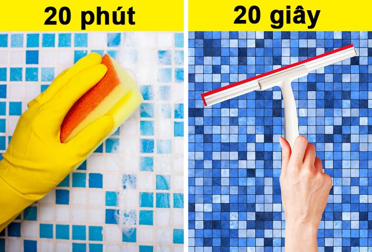Sau khi tắm xong, hãy lau sạch nước trên tường nhà tắm bằng chổi cao su. Nhờ mẹo này, bạn sẽ không phải mất thời gian dọn dẹp cặn xà phòng bị bám lại trên tường.