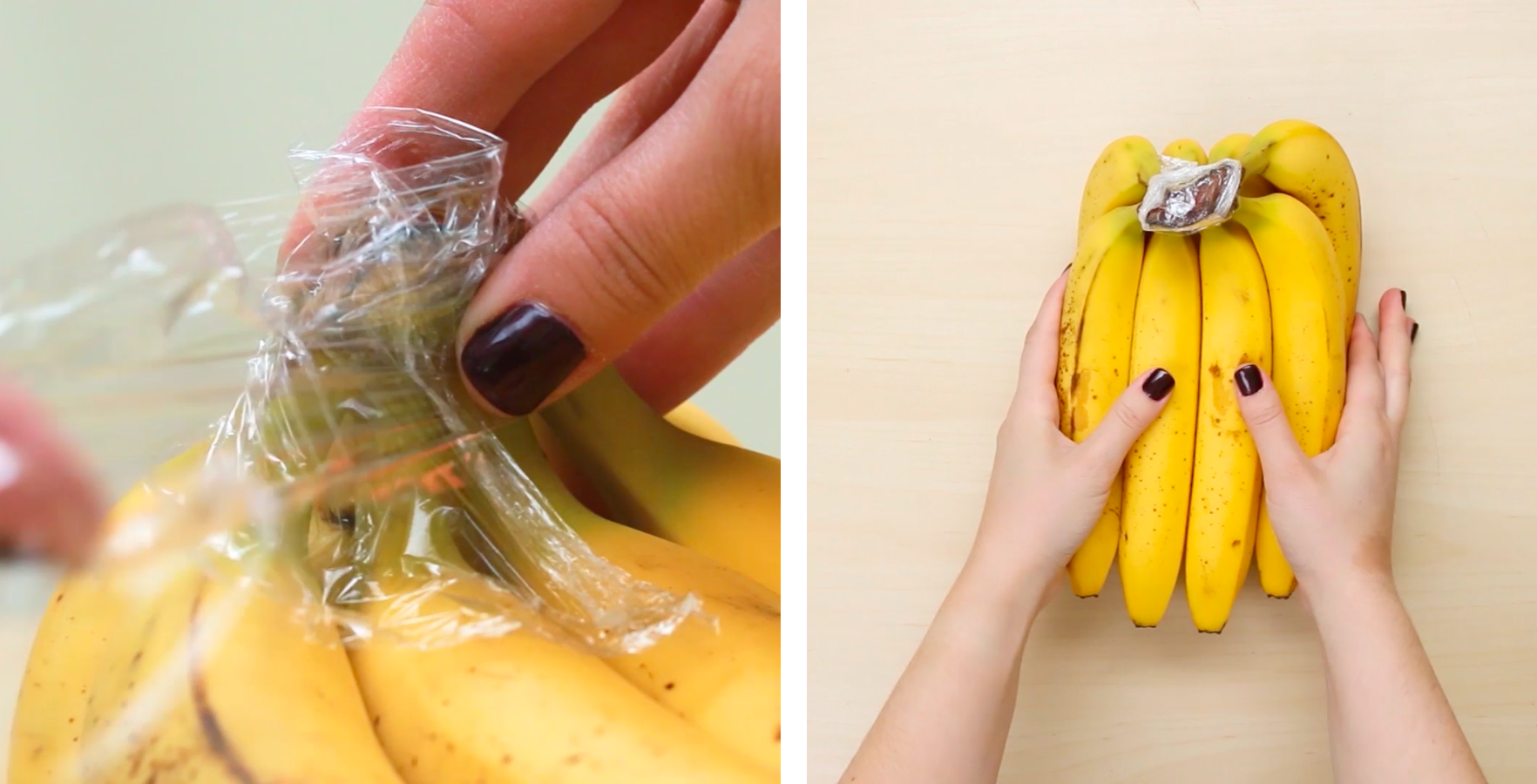 Bọc màng bọc thực phẩm quanh phần cuống chuối sẽ làm hạn chế việc thải khí ethylene, từ đó giúp chuối lâu bị thâm và hỏng hơn.