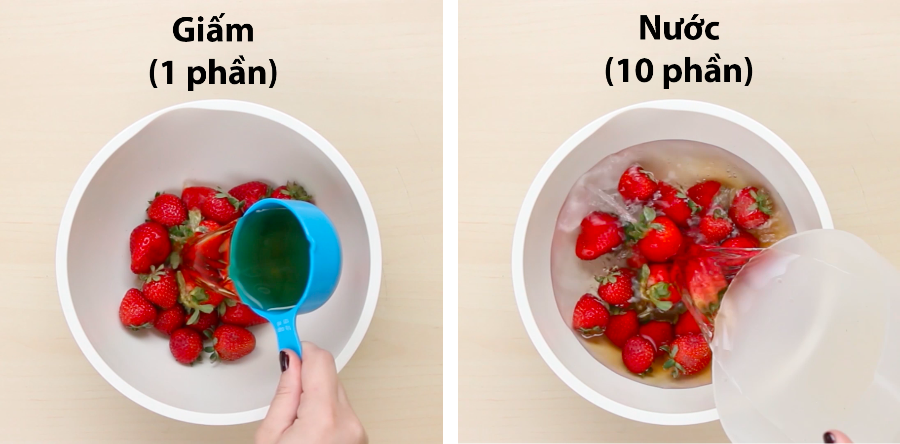 Giấm sẽ tiêu diệt nấm mốc trên dâu tây, bên cạnh đó, nó cũng không làm ảnh hưởng tới vị ngon ngọt của dâu. Hãy ngâm dâu trong hỗn hợp giấm và nước theo tỷ lệ 1:10, sau đó rửa lại với nước sạch và lau khô, cho vào tủ lạnh.
