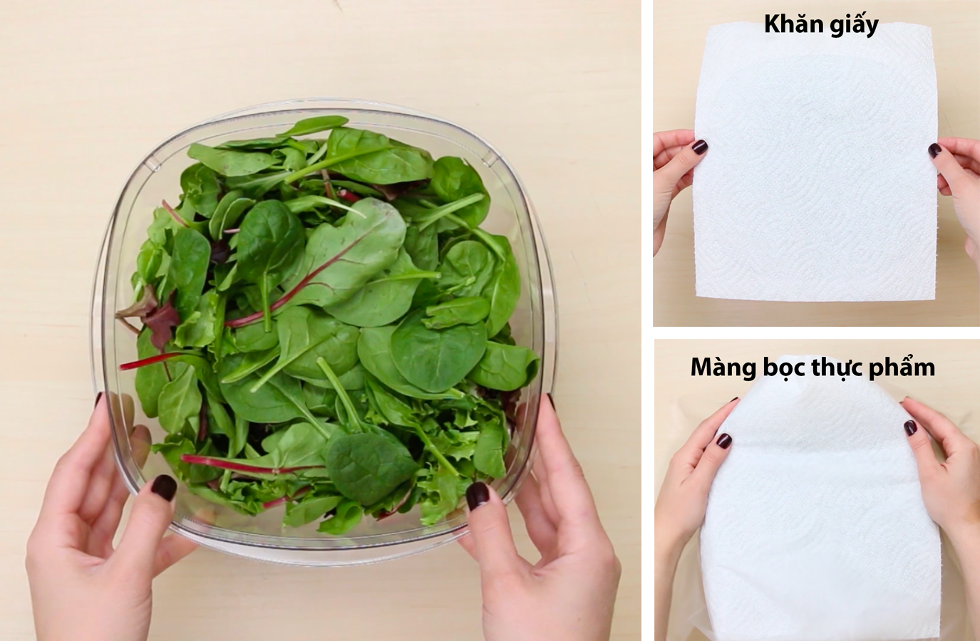 3. Bọc hộp đựng rau diếp bằng khăn giấy khô và màng bọc thực phẩm