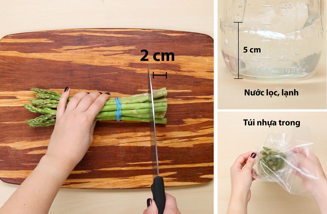 Sau khi cắt khoảng 2cm ở phần cuống măng tây, bạn cắm chúng vào lọ đựng nước lạnh rồi lấy túi nhựa trong đậy lên. Hãy chú ý đến lọ nước, nếu nó bị đục hãy thay nước nhé. Với cách này, bạn có thể giữ măng tây tươi đến cả tuần.