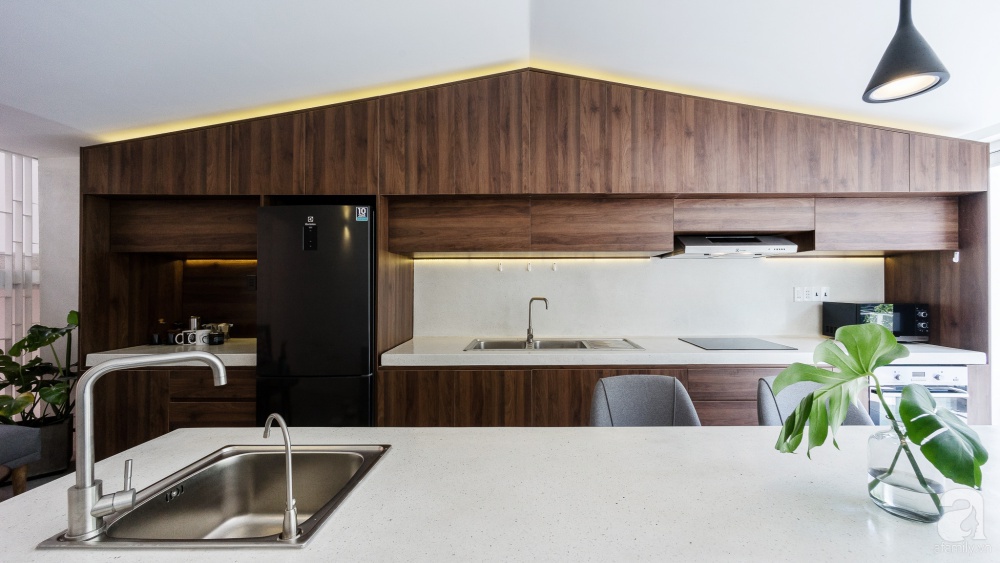 Hệ thống đèn Led màu vàng ấm cúng giúp cho không gian nấu nướng với chất liệu gỗ, màu sắc nhã nhặn trở thành điểm nhấn cho ngôi nhà phố thêm tiện nghi.