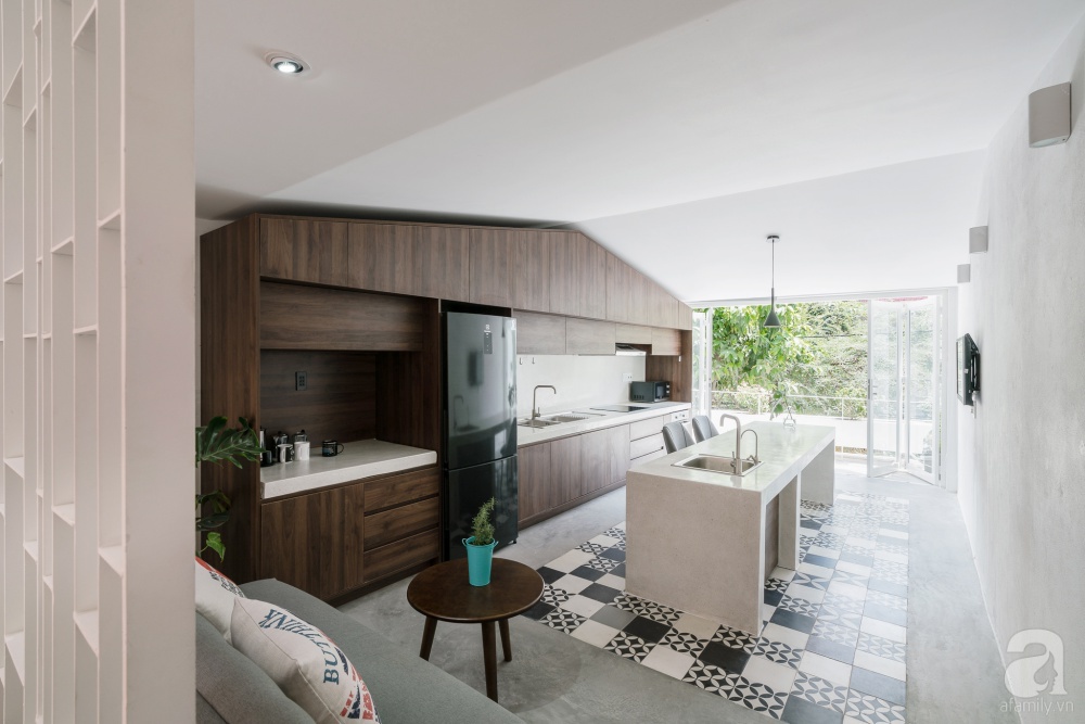 Phòng khách với bếp thông nhau tạo nên một khoảng không gian mở với phong cách trẻ trung, khác với cấu tạo của các căn nhà ống thường thấy.