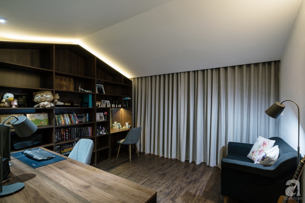 Ngăn cách khu vực nghỉ ngơi với nơi làm việc bằng rèm cửa màu ghi trang nhã. Hai khu vực chức năng được tách biệt bằng rèm đủ để tạo thêm công năng và giúp mọi người trong cùng một tầng có thể thoải mái sử dụng những chức năng phù hợp.