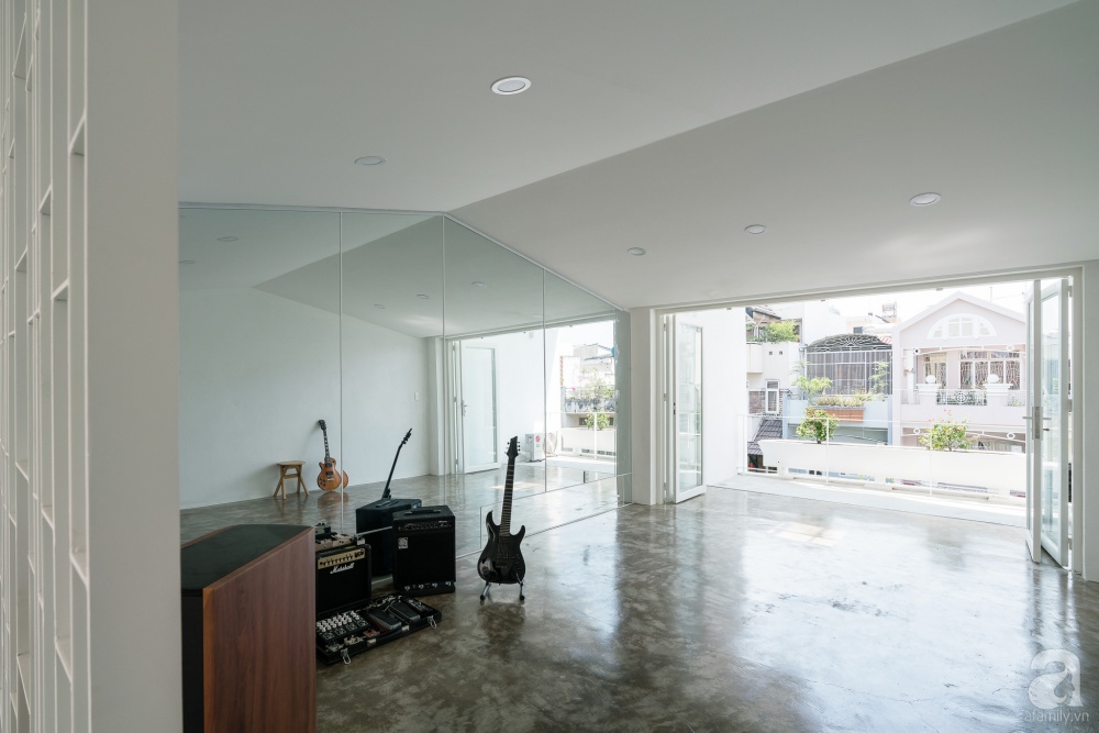 Tầng 4 được mở rộng tối đa, thoáng sáng với một bức tường được gắn gương để nhân đôi không gian, tiện lợi cho việc tập Gym và nghệ thuật. Ánh sáng ngập tràn được tiếp nối giữa mặt sàn với khoảng không gian bên ngoài.