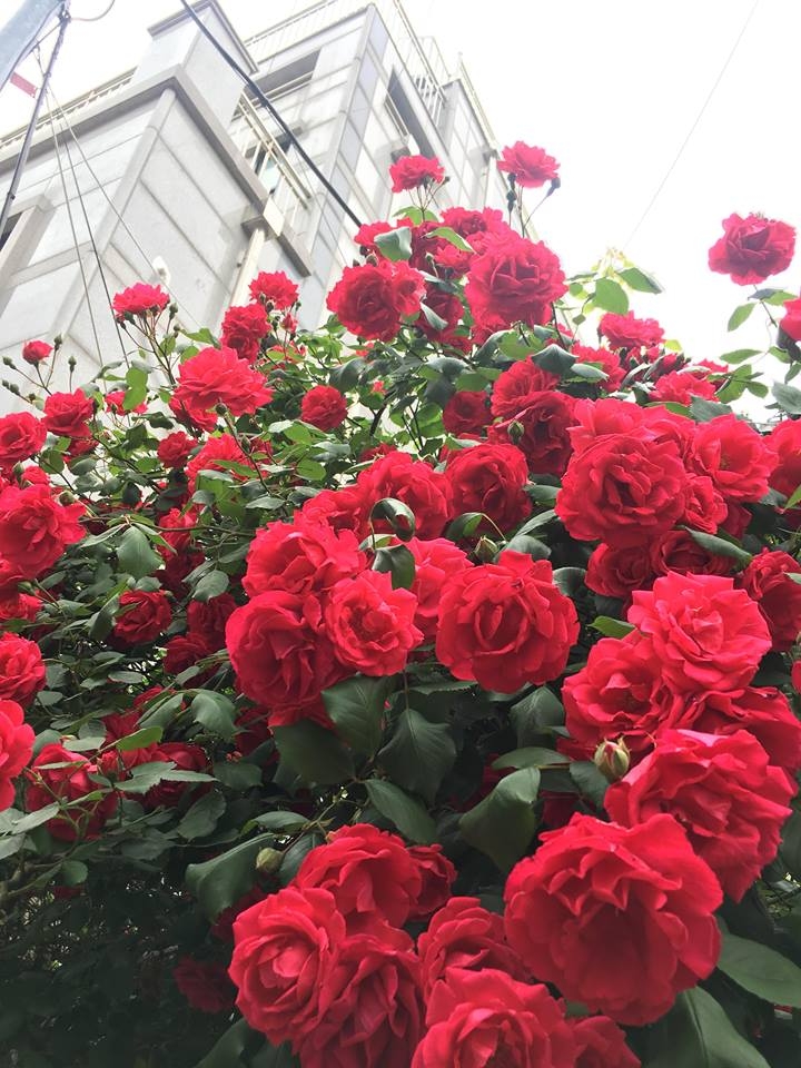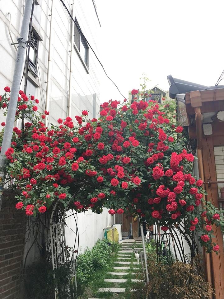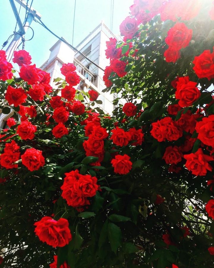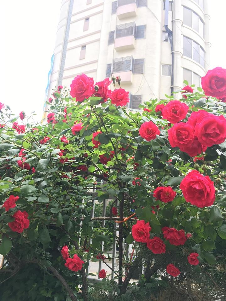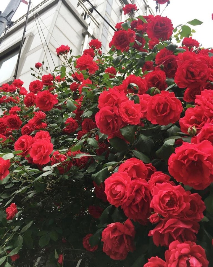 Những cành hoa hồng chi chít hoa với màu đỏ rực rỡ nhìn giống như một bức tranh dịu dàng về cuộc sống trong mơ khiến ai ngắm nhìn cũng một lần ao ước được ngắm nhìn.