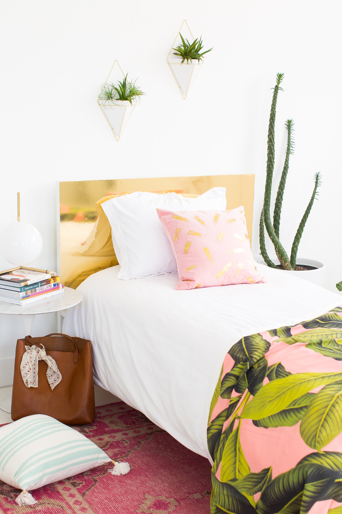 Nếu bạn muốn đem đến cái nhìn hiện đại ngay trong phòng ngủ, hãy thử dán giấy màu vàng, đồng hoặc đá cẩm thạch ở đầu giường. Đây sẽ là ý tưởng không tồi chút nào.