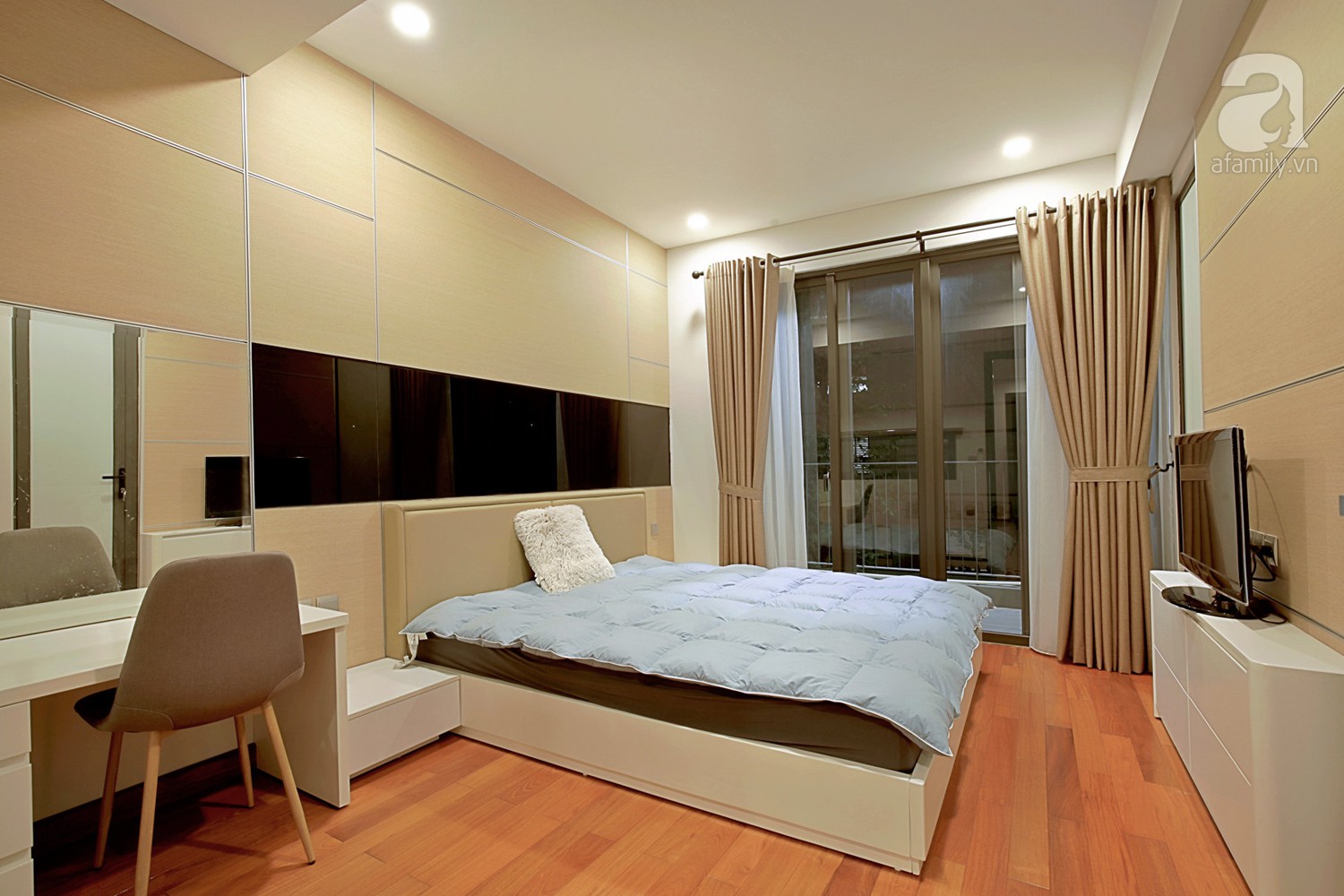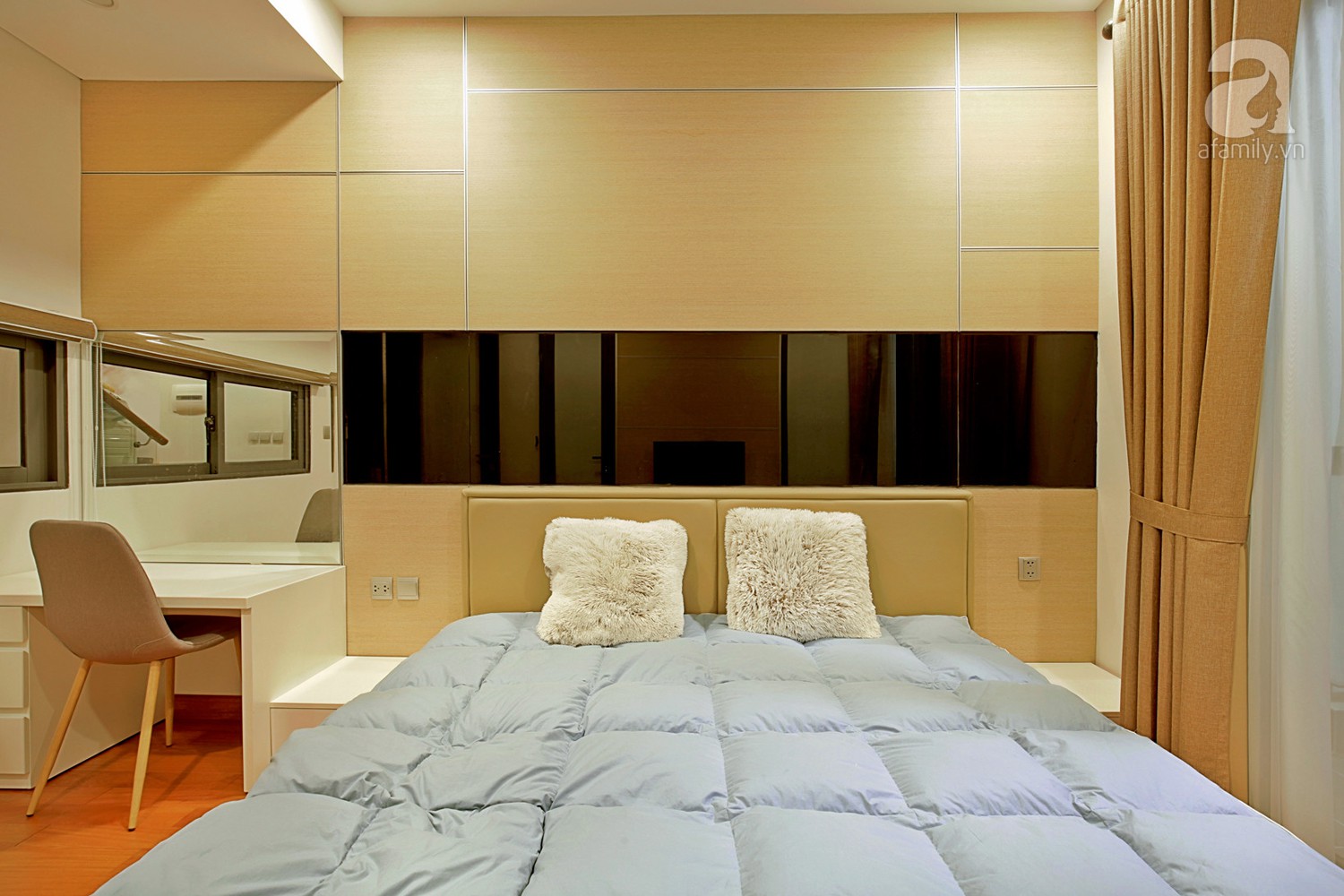 Phòng ngủ của vợ chồng anh Kiên rộng rãi, thoáng đáng với lối thiết kế tối giản. Những món nội thất thiết kế thành hệ liên hoàn giúp căn phòng đầy đủ tiện nghi mà vẫn gọn gàng. Căn phòng không bị "ngộp" trong đồ đạc cộng với thiết kế nhã nhặn tạo nên bầu không khí thư giãn, nghỉ ngơi.