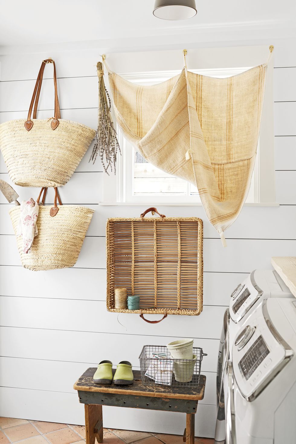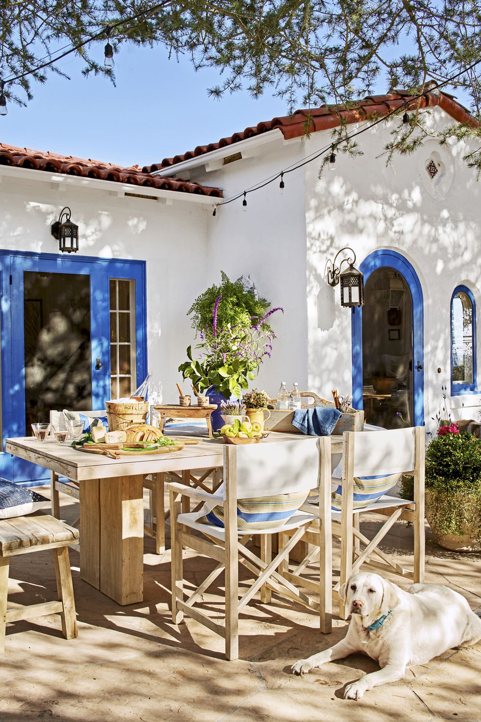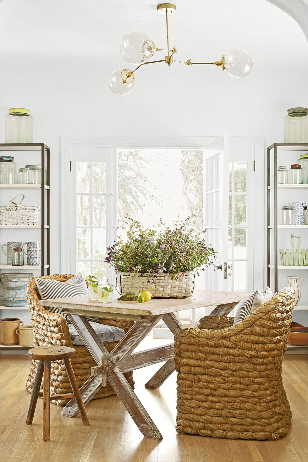 Phòng ăn tiếp tục là sự kết hợp giữa phong cách hiện đại và cổ điển vì bàn ghế được làm từ tre và gỗ nhưng đèn trần, cửa ra vào và tủ lưu trữ lại đi ngược lại.