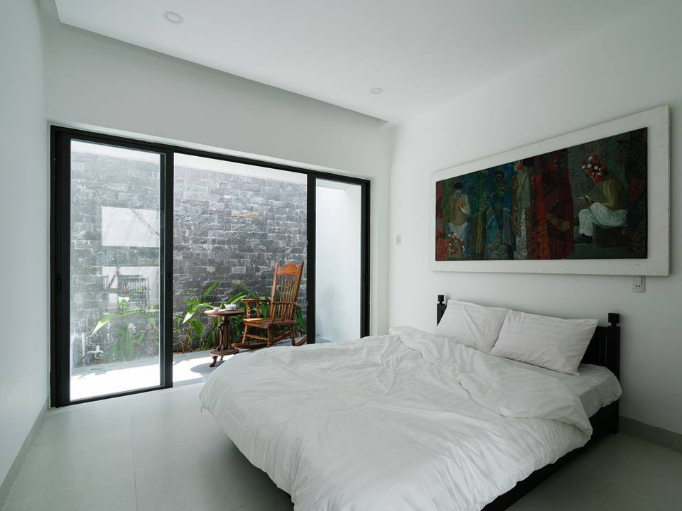 Các phòng ngủ trong nhà khá đơn giản nhưng tiện nghi và đều được tiếp cận ít nhiều với cây xanh. Thêm vào đó, những món nội thất bằng chất liệu gỗ mộc sẫm màu cũng thể hiện đúng theo tinh thần hiện đại giao thoa với truyền thống của ngôi nhà.