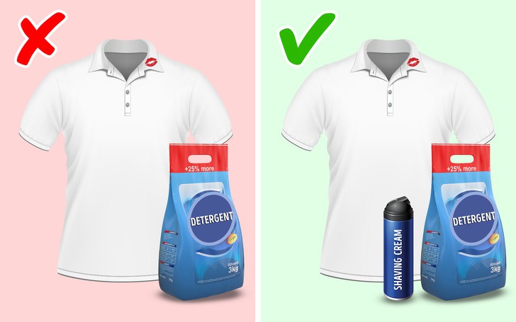 Bột giặt thông thường sẽ khó loại bỏ hoàn toàn vết bẩn do trang điểm như son môi. Hãy bôi một lớp kem cạo râu lên trên vết son, rồi giặt quần áo như thường, vết son sẽ biến mất.